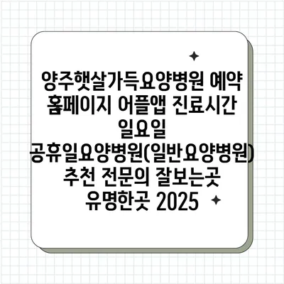 양주햇살가득요양병원은 예약 홈페이지 및 어플을 통해 간편하게 진료를 예약할 수 있는 요양병원입니다. 우리 병원은 진료시간이 유연하여, 일요일 및 공휴일에도 신청를 …